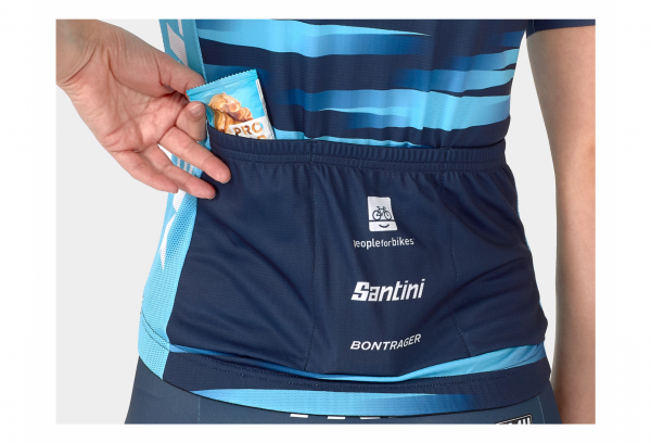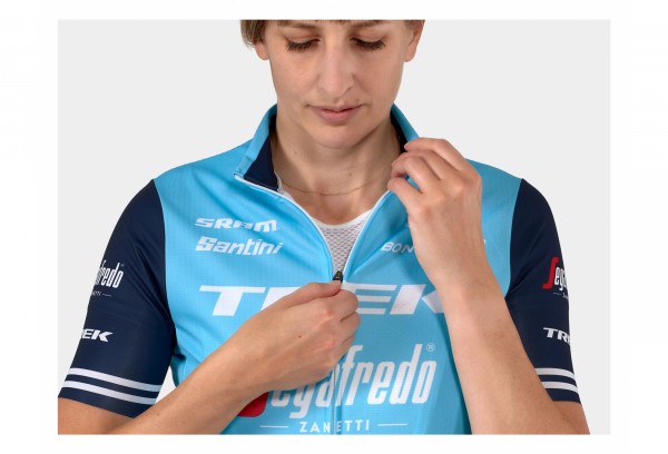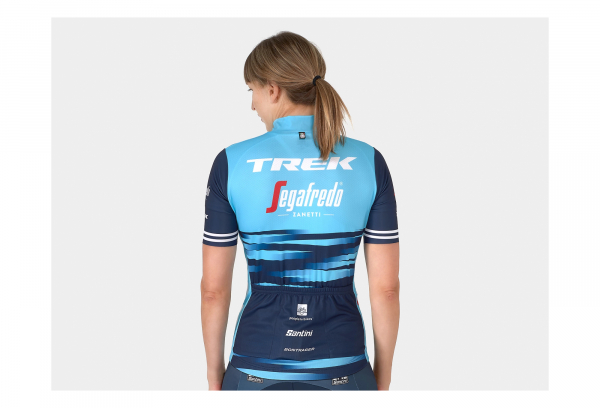 Tenue officielle de l’équipe fabriquée par Santini arborant fièrement le logo de l’équipe Trek-Segafredo.